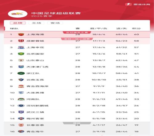 海港终结联赛四连胜,最新的积分榜中,球队仍列榜首,但仅领先蓉城2分,蓉城今晚若战胜青岛西海岸,则升至榜首;申花今晚对阵大连英博,球队积57分暂列第三。
